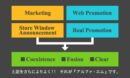 アルファ・エムとはエム(メディア、マーケティング)をさらにもう少し、よりよい形に(アルファ)を意図した造語です。
