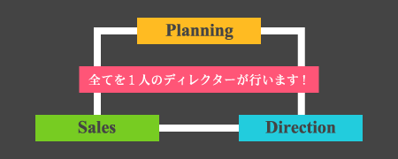 アルファ・エムでは所謂ディレクターと呼ばれる人間が、「営業」、「プランニング」、「ディレクション」を一括して行います。